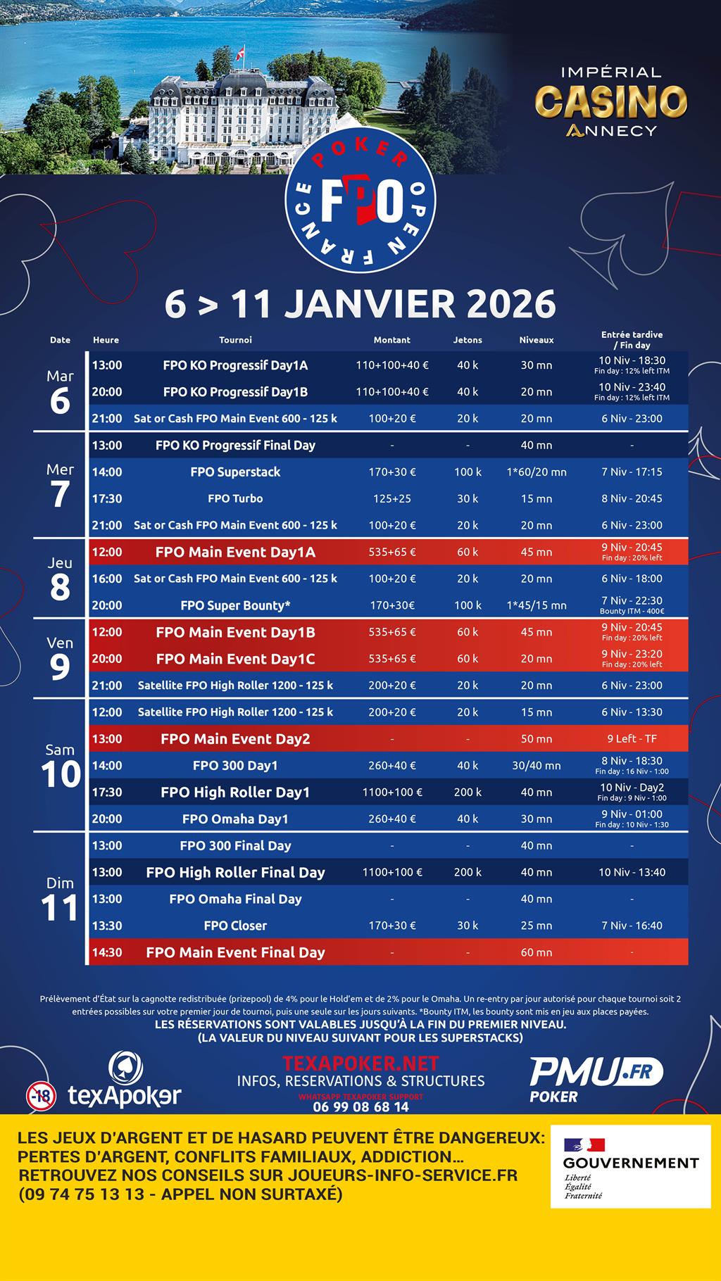 >> Infos et réservations pour le FPO Annecy (6 au 11/01) : https://www.texapoker.net/fr/tournois-poker-live/annecy-imperial-france-poker-open_2724.html